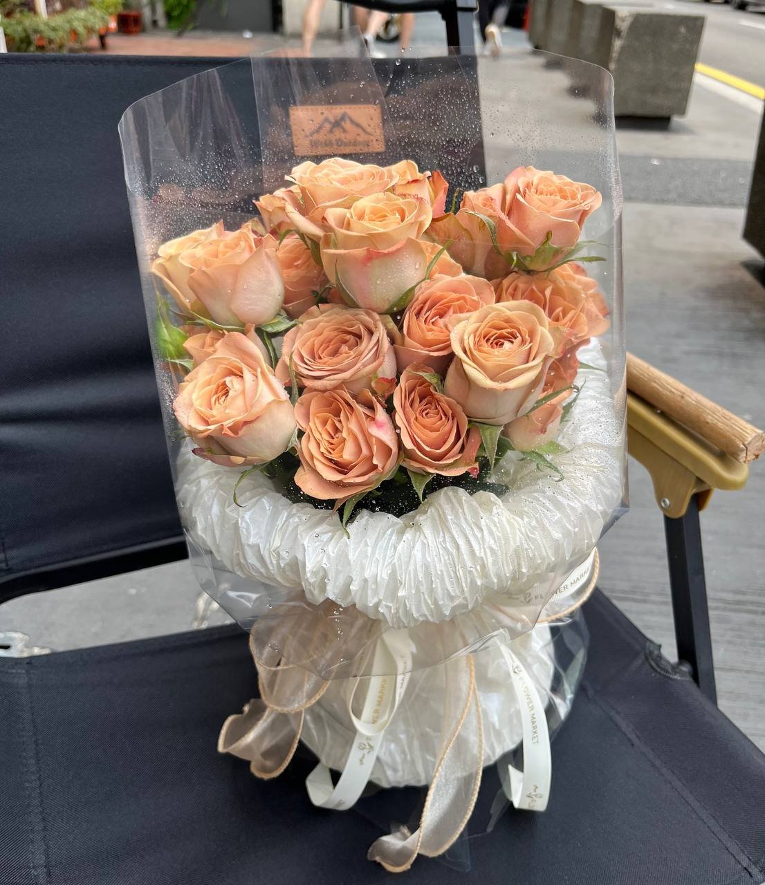 Unveil the delightful Apricot Dreamlet, a precious collection of radiant apricot-hued roses, glowing with a subtle warmth. Lovingly swathed in crisp white textured paper and clear wrap, then adorned with a delicate golden bow, this bouquet is a miniature dream, a symbol of joy and cherished moments, designed to bring an instant smile.