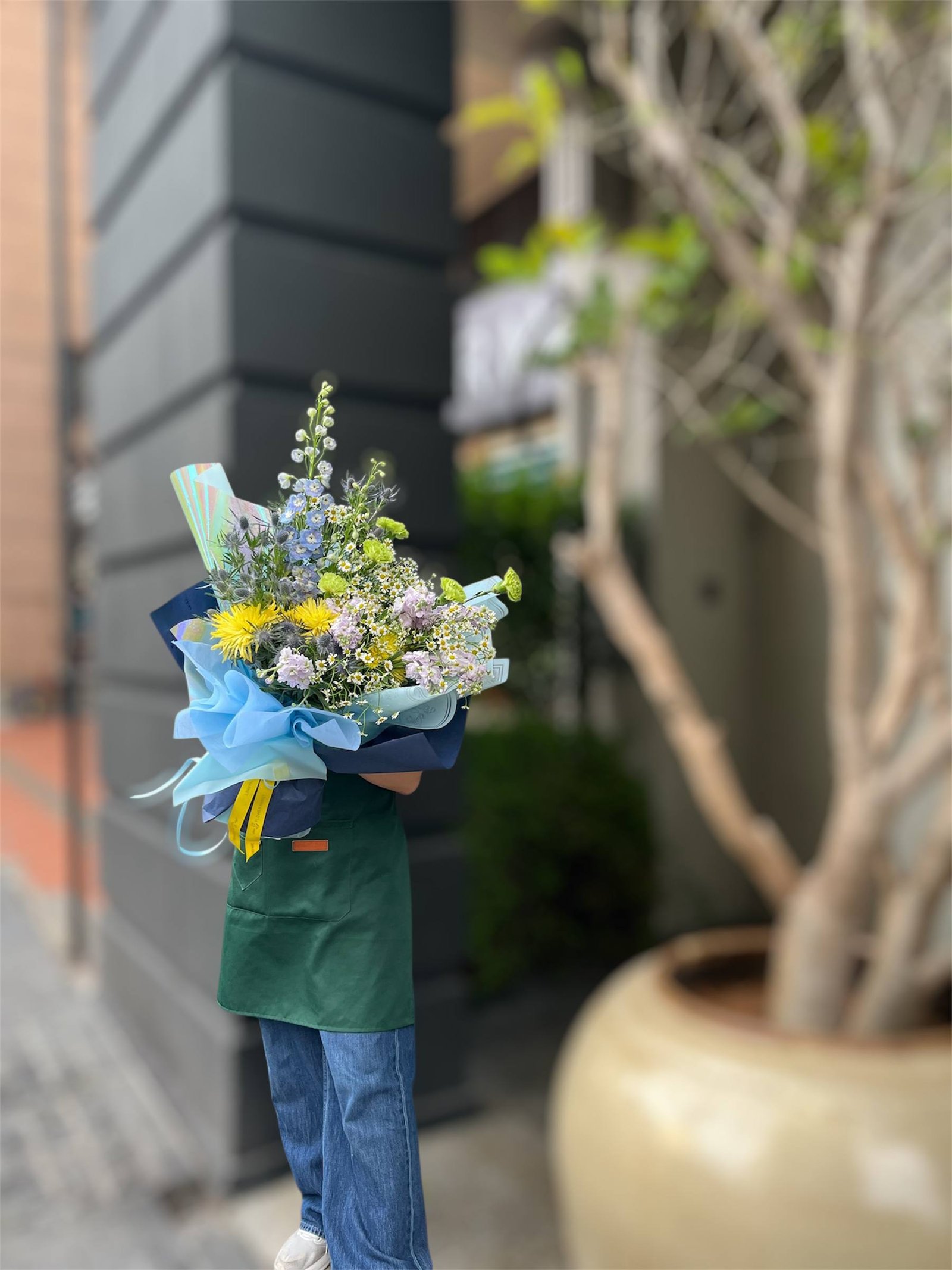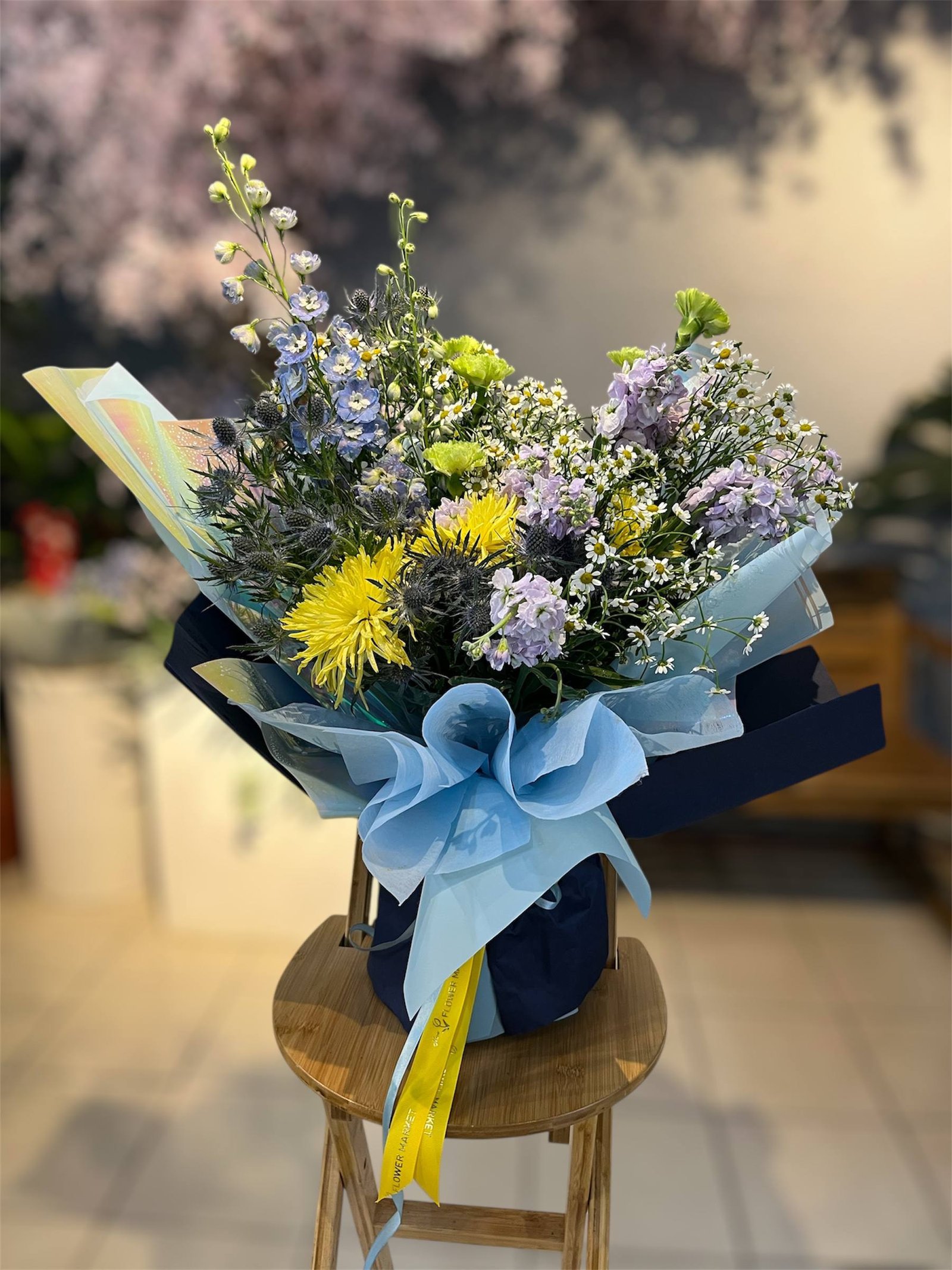Like a sweet blueberry treat, ‘Blueberry Bliss’ combines the soft beauty of blue delphiniums with the vibrant charm of yellow chrysanthemums and delicate white daisies. This bouquet is a delightful expression of happiness, perfect for creating memorable moments.