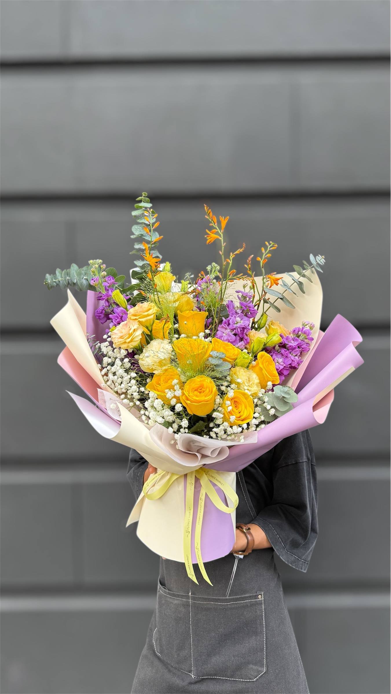 Let the “Radiant Joy Bouquet” illuminate your special moments. A stunning collection of bright yellow roses forms the core of this arrangement, bursting with energy and optimism. Accented with soft purple flowers and a delicate mist of baby’s breath, and framed by the subtle elegance of eucalyptus, this bouquet is a vibrant celebration of happiness and a perfect way to send a message of cheer.