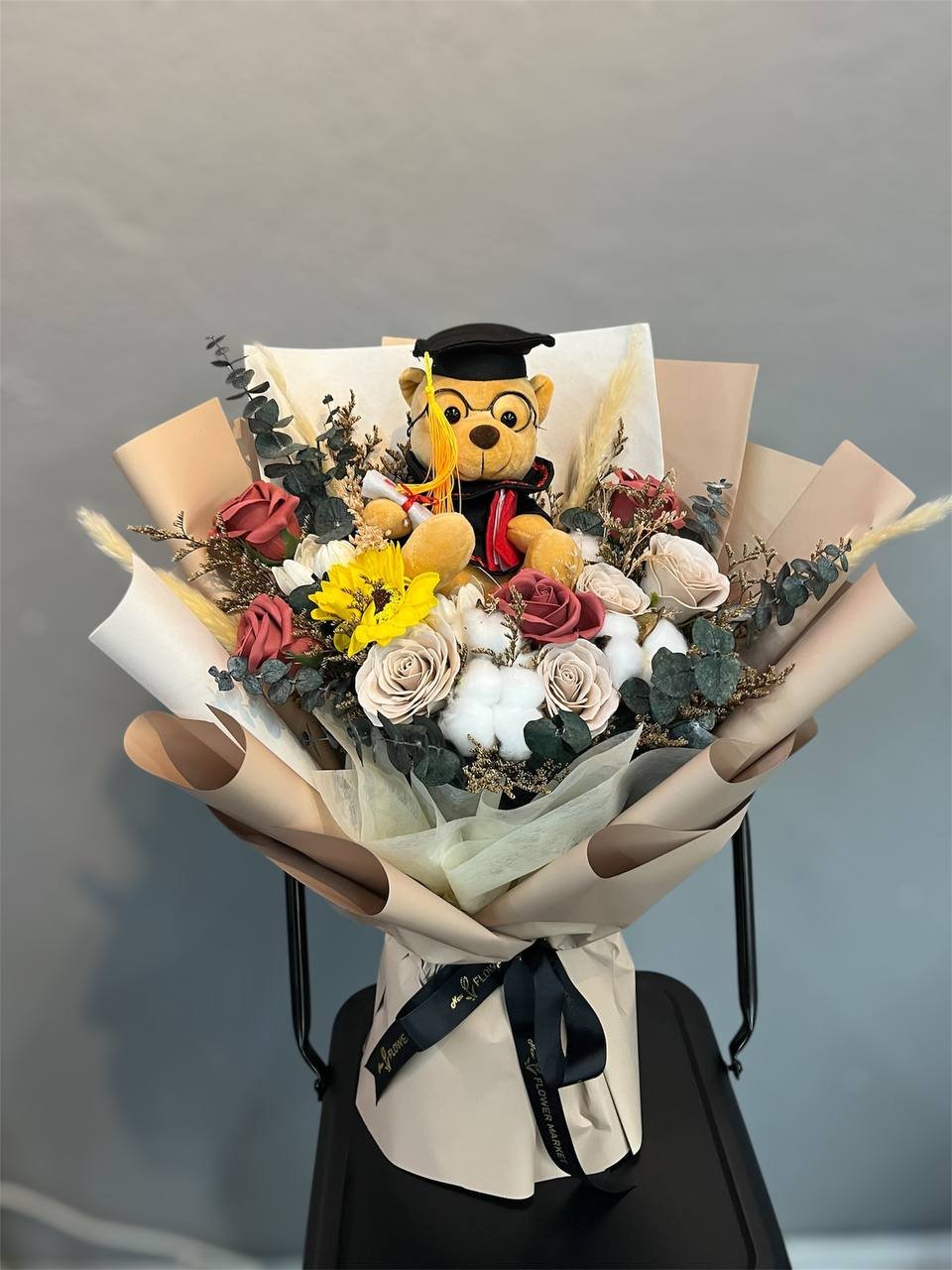 Honor their academic success with the Scholarly Blooms bouquet, a delightful combination of soap flowers and a graduation bear. Burgundy and cream roses are accented by a sunny sunflower, representing knowledge and achievement. This elegant bouquet is a thoughtful way to express your pride and admiration.