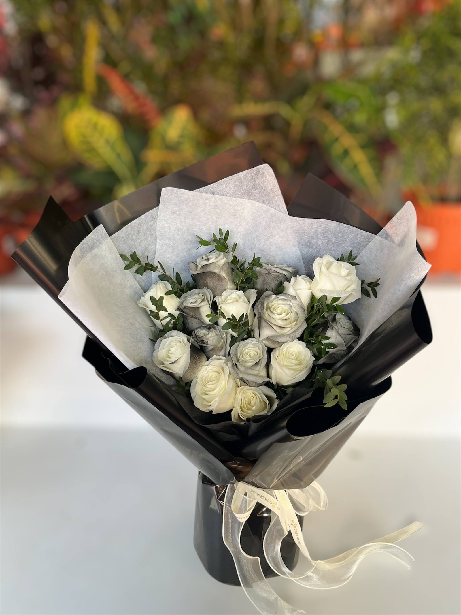 Like the moon illuminating the night sky, Seri Mawar Malam emerges, a bouquet that captures the essence of elegance and understated beauty. Grey and white roses, like whispers of a secret romance, are accented by delicate greenery, creating a tapestry of textures and tones. Wrapped in layers of black and white paper, like a batik design unfolding in the moonlight, this bouquet speaks of mystery, sophistication, and the allure of the unknown. Let it be a reminder that life is a journey to be savored, a dance of emotions and experiences that unfold with every passing moment, as beautiful and complex as a traditional Malay pantun.