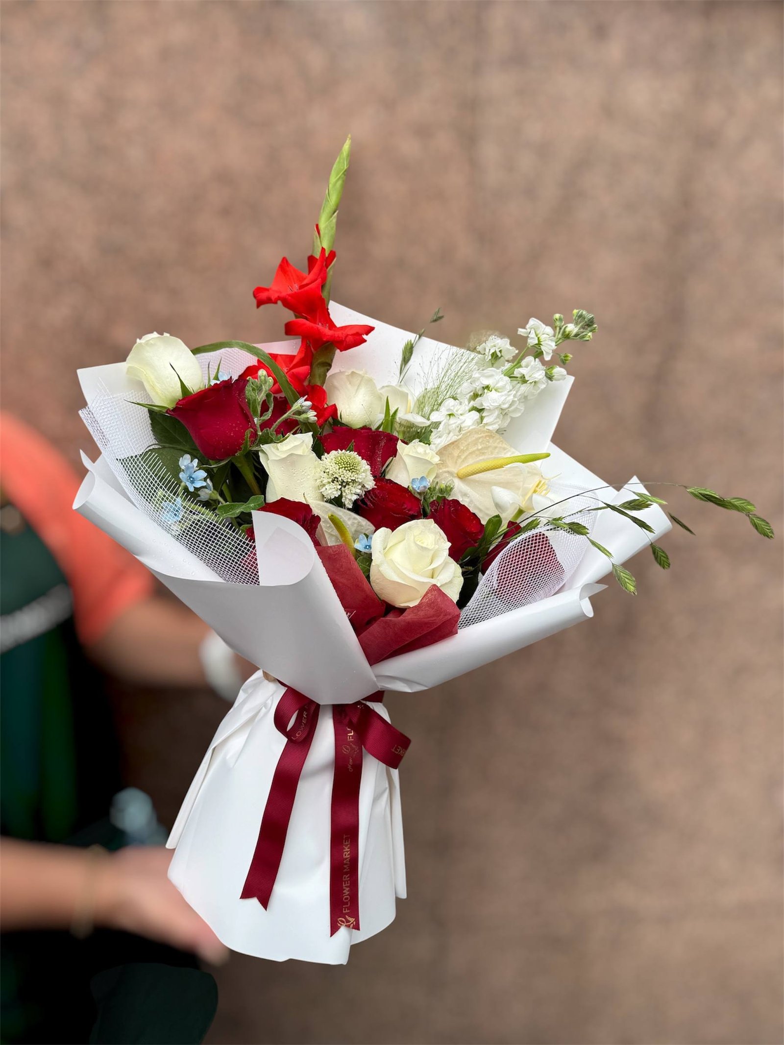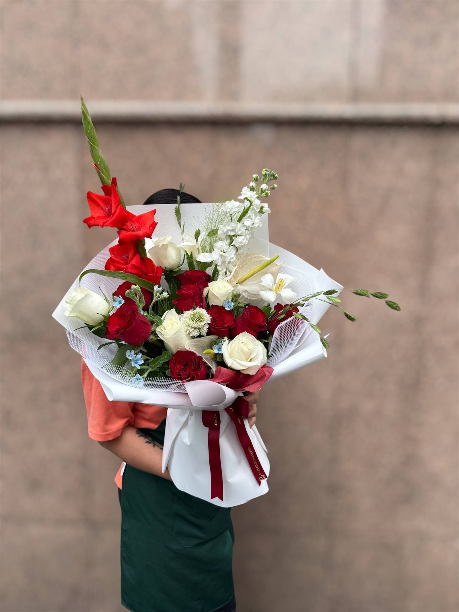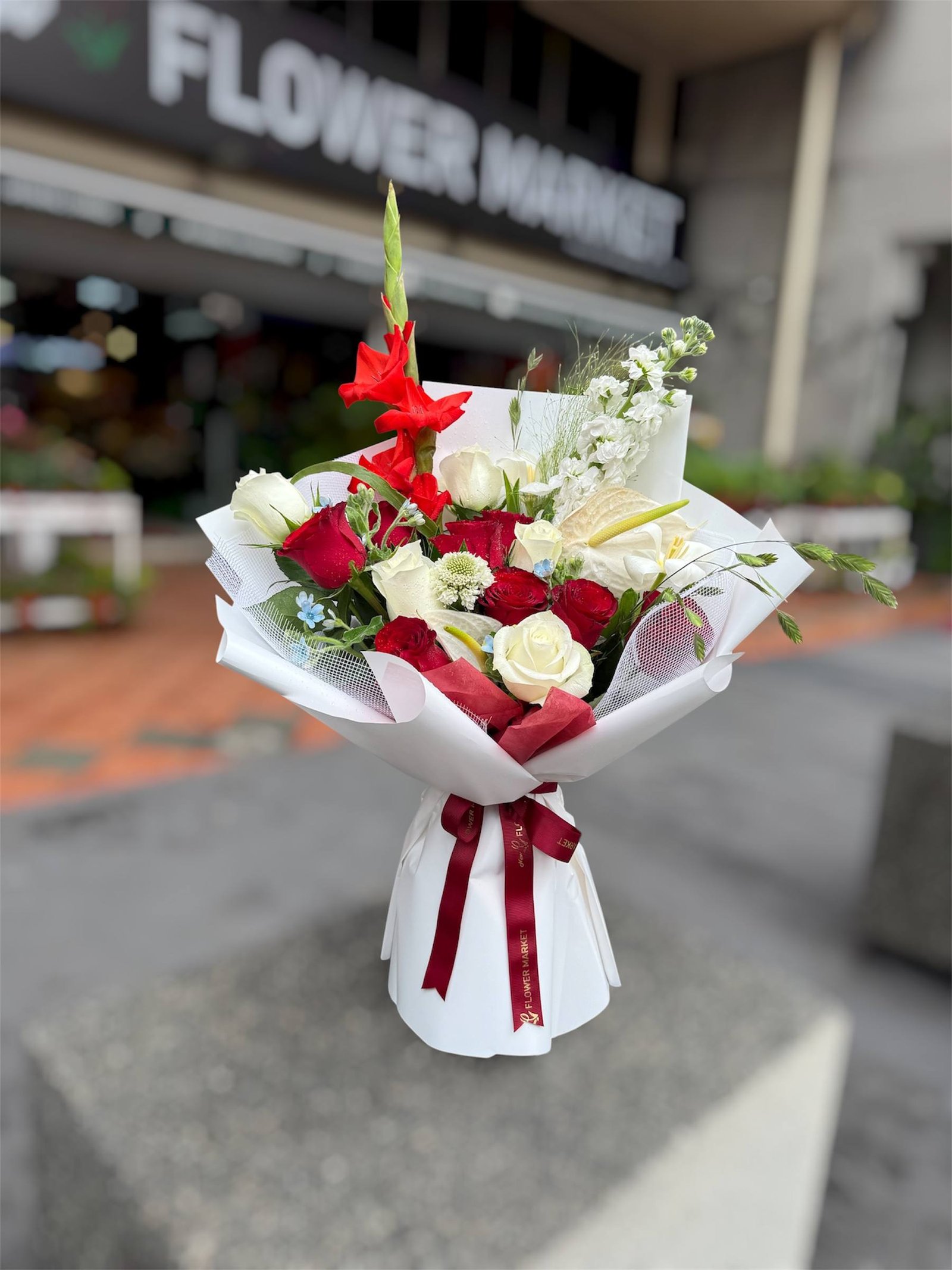 Stand tall with The Sentinel’s Bloom. This commanding bouquet, featuring the striking gladiolus as its sentinel, is a powerful display of strength and beauty. The classic combination of red and white roses symbolizes both passion and purity, creating an arrangement that is both bold and deeply meaningful.